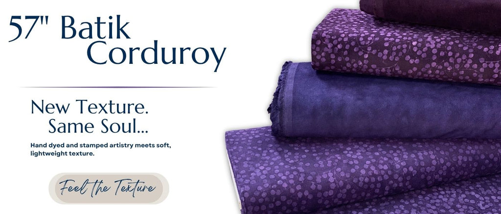 Our Batik Corduroy is 100% cotton, 16-wale, lightweight, and 57" wide. Hand-dyed and stamped in our signature batik process, each yard is soft, colorful, and uniquely textured. It’s easy to care for—machine wash, tumble dry low, or lay flat to finish.