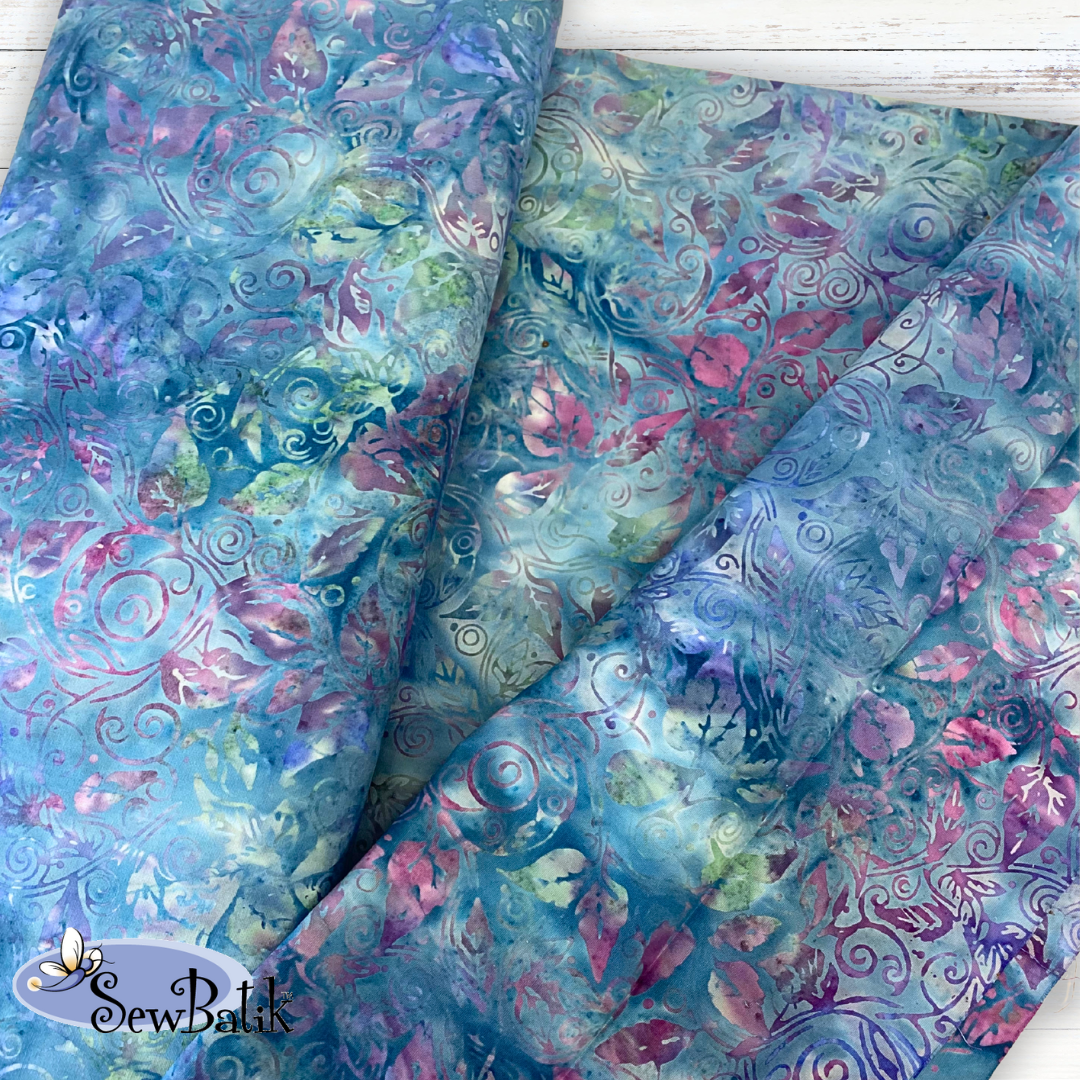 Verde — a lush leaf-and-vine batik with playful spiral tendrils, printed allover in a soft, non-directional repeat.