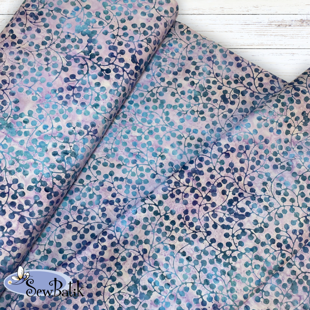Suave Lilac blends pale lavender with cool periwinkle and soft blue tones, creating a fresh, airy purple with natural batik variation.