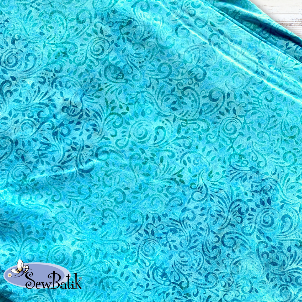 72" Wide Batik Cotton Jersey Knit. This is a very stable knit with very little one way stretch. It's 100% cotton. It's a great weight for t-shirts, dresses, jackets and accessories.