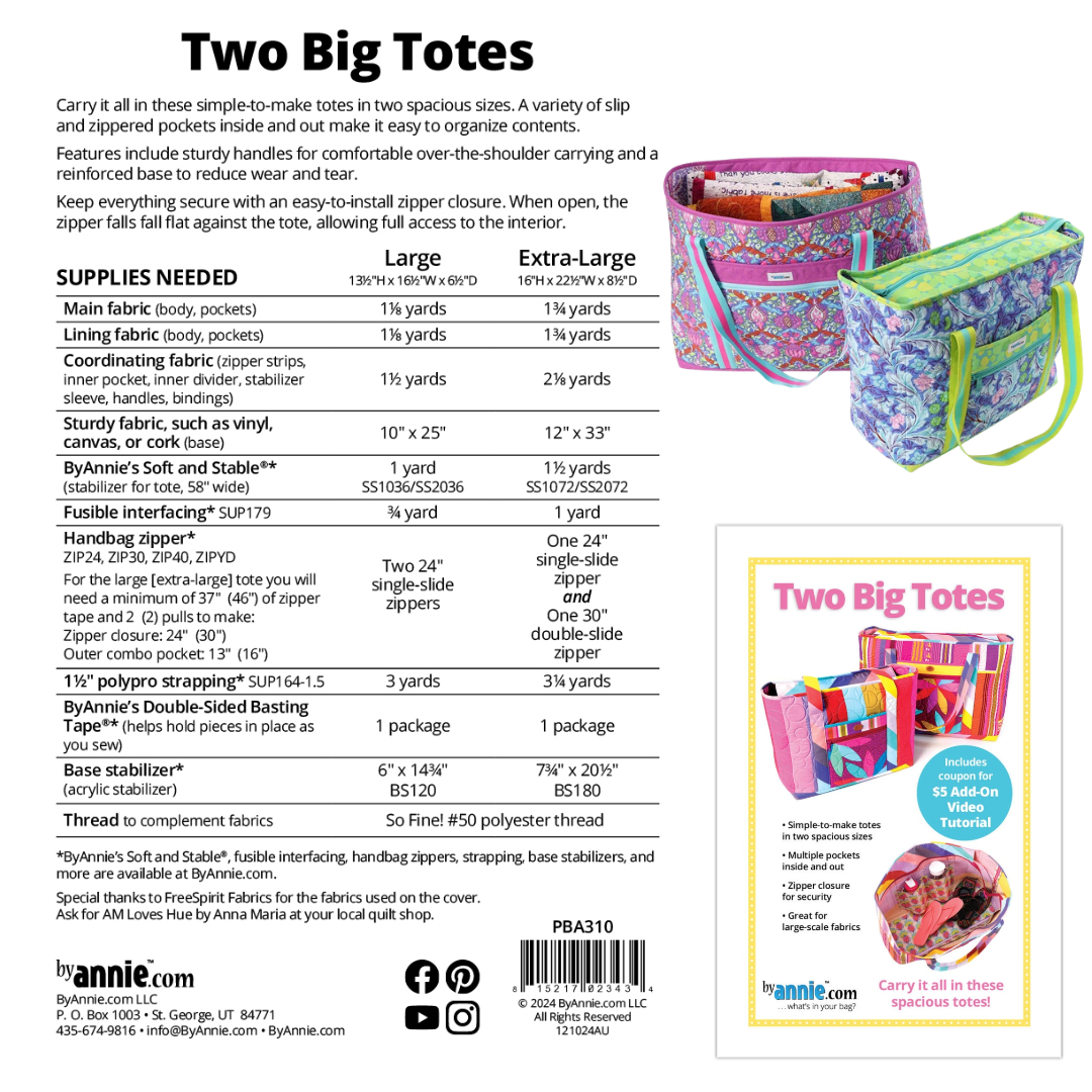 This versatile pattern includes instructions for creating two spacious totes—large and extra-large—perfect for everything from beach days and grocery runs to weekend getaways and sewing retreats.