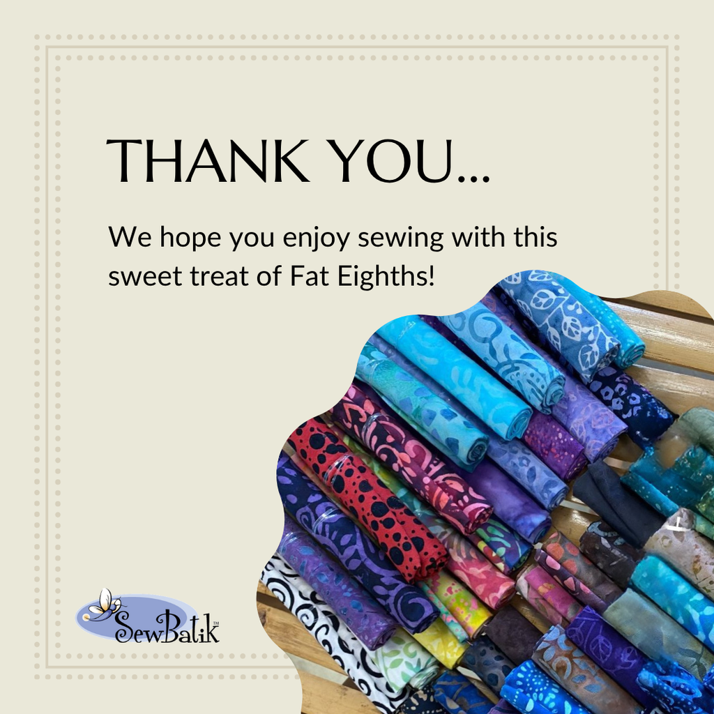 Thank you for supporting SewBatik with your purchase of $50 or more of running yardage featuring a selection from our Batik Cotton Collections. This may include 112" wide Batik Cotton, 45" Batik Cotton, and Nuance Gradation Batiks.